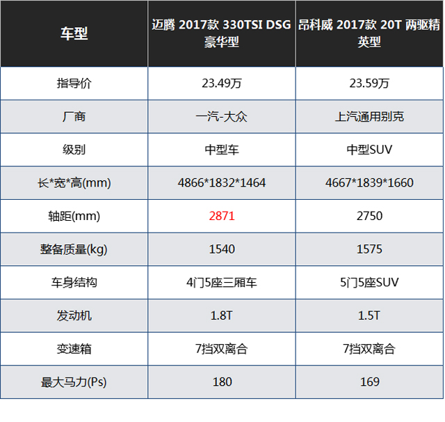 虽然昂科威是一款中型SUV,但全新迈腾可是采用了全新的MQB平台,经过加长后无论车身尺寸还是轴距都比昂科威大那么一圈。加上迈腾扁平化的车身的设计,迈腾给人更大的视觉宽度。