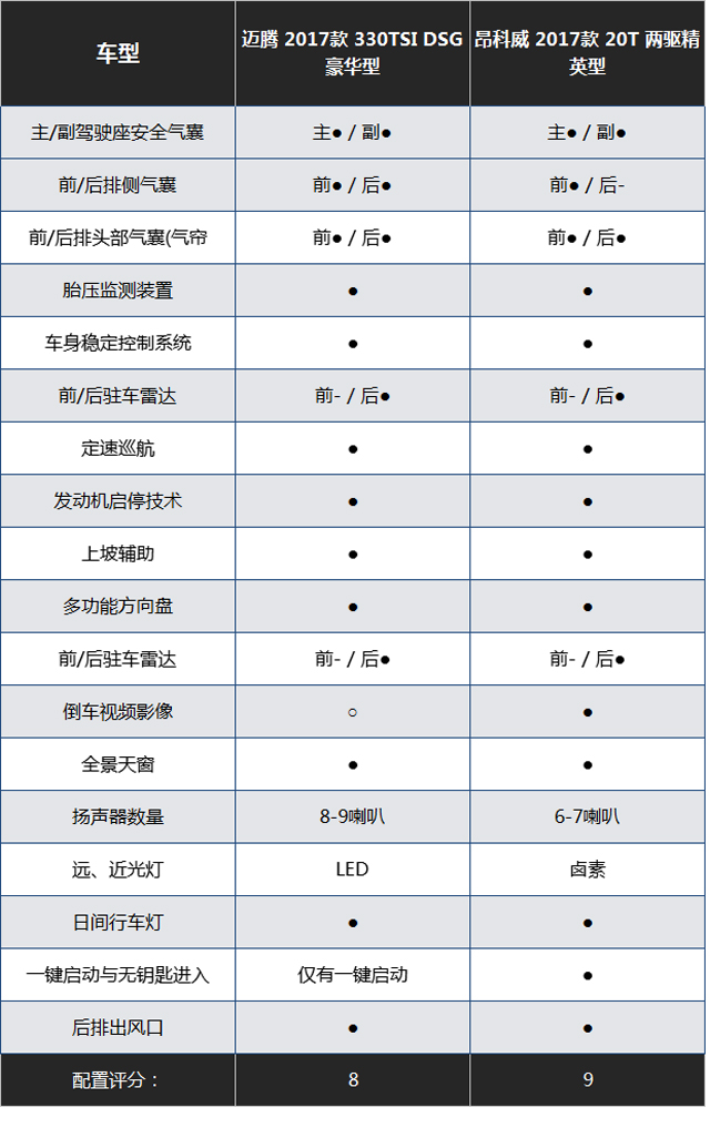 两款车的推荐车型都已经接近24万了,配置再不够丰富就真的需要拉出去吊打了。我们在迈腾的豪华版身上也基本上看不出什么简配的嫌疑。昂科威毕竟是主打配置与性价比的一款SUV,因此无论是安全配置还是舒适配置都一应俱全。