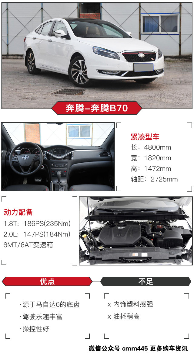 奔腾B70是一汽集团首款自主中级车,轿跑设计的外观造型比较讨人喜欢,分为普通版本和运动版本两个车型,满足不同消费者的需求。当然小虎觉得买这车的消费者,都是冲着它使用了马自达6相同的动力系统以及底盘,操控性上很有优势,驾驶乐趣更为丰富。前双横臂+后多连杆独立悬挂调校整体偏硬朗,在经过非铺装路面时对一些细碎的震动过滤不是很彻底,不是很适合追求舒适性的消费者。