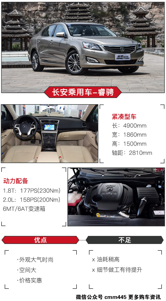 长安一直以来都给人低调务实的感觉,为了提升品牌形象将会研发出越来越多的中大型车,睿骋作为长安汽车的旗舰车型,产品力可是相当强。这里主要说下睿骋的科技配置:全速自适应巡航可在0-150km/h实现自动跟车,手机app远程控制空调设定,门锁的开闭、监测车况、寻车等功能,6安全气囊给你较为全面的安全保护。1.8T发动机搭配爱信的6AT变速箱,动力输出相当顺滑,接近于自然吸气发动机,舒适性好。