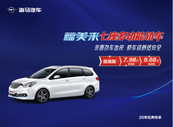 福美来七座多功能轿车在七座家用车市场上拥有明显的优势,轿车级平台血统、轿车级舒适、操控、安全和灵活空间运用能力,远非市面上那些微面升级MPV可比,驾乘体验和行驶质感都要好得多。一汽海马方面非常看好福美来七座版在市场上的独特优势,不但拥有五座轿车舒适/操控/安全等方面的优势,还兼具七座车的大空间优势及空间组合功能。也因为此,一汽海马在原有的福美来七座版基础上,海马再加推两款超值版车型,新车已于5月18日上市,包括搭载1.5T发动机的2款车型,其中手动版售价7.98万元,自动版售价9.68万元,冲击10万级以下自主七座家用车市场。