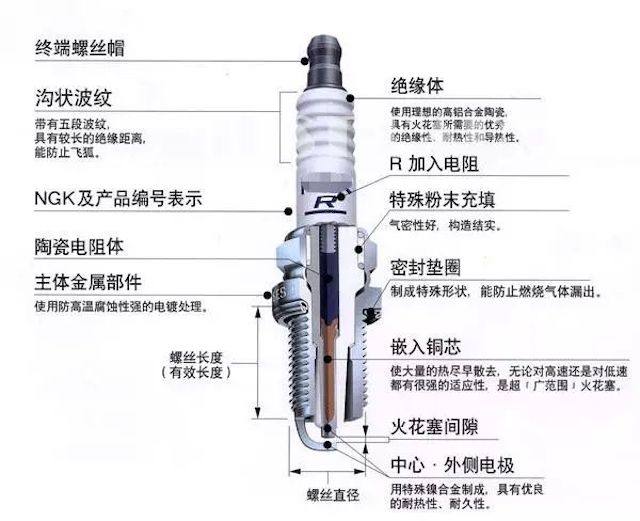 改装点火系统最容易也是最便宜的第一步,就是把原厂的火花塞换上高性能型号。火花塞基本的作用是强迫点火线圈产生的高压电流通过一个电极间隙时产生火花来点燃汽缸燃烧室内的混合气,因此对火花塞的性能要求当然是火花越强、越稳定越好。原车的火花塞地极和高压的中心电极之间绝缘体大多用以成本较低的氧化铝为基础的陶瓷制造,但高性能型号火花塞在电极的材料上则讲究得多。现在高质量的火花塞大都采用铱或铂等贵金属来制造电极,除了可发出更强而稳定的火花外,还更加耐用。