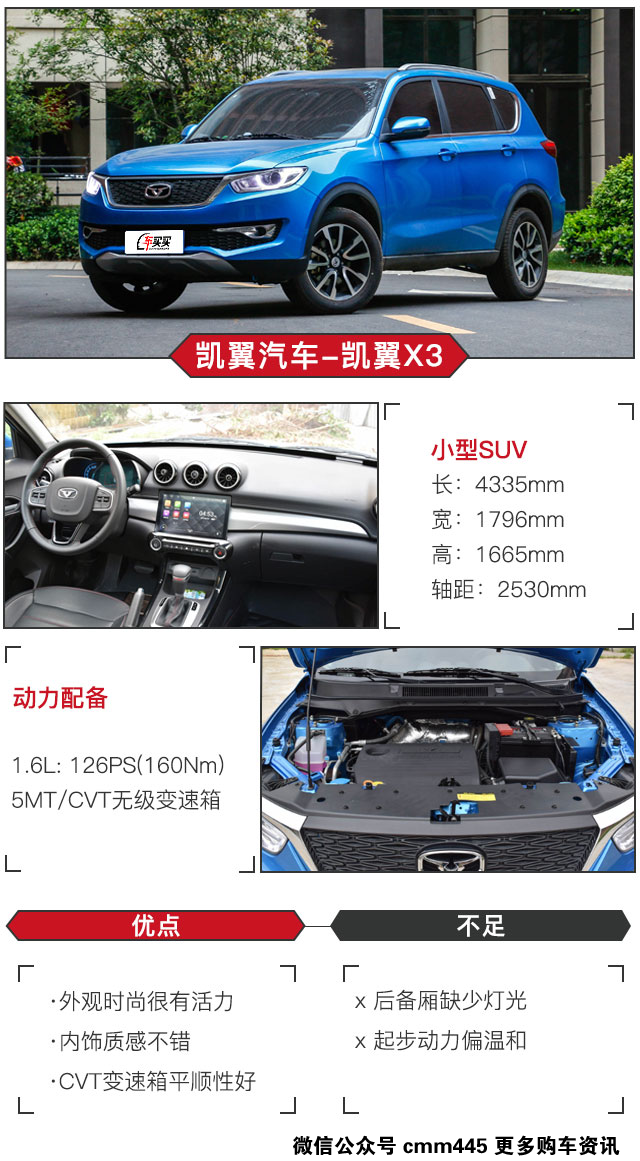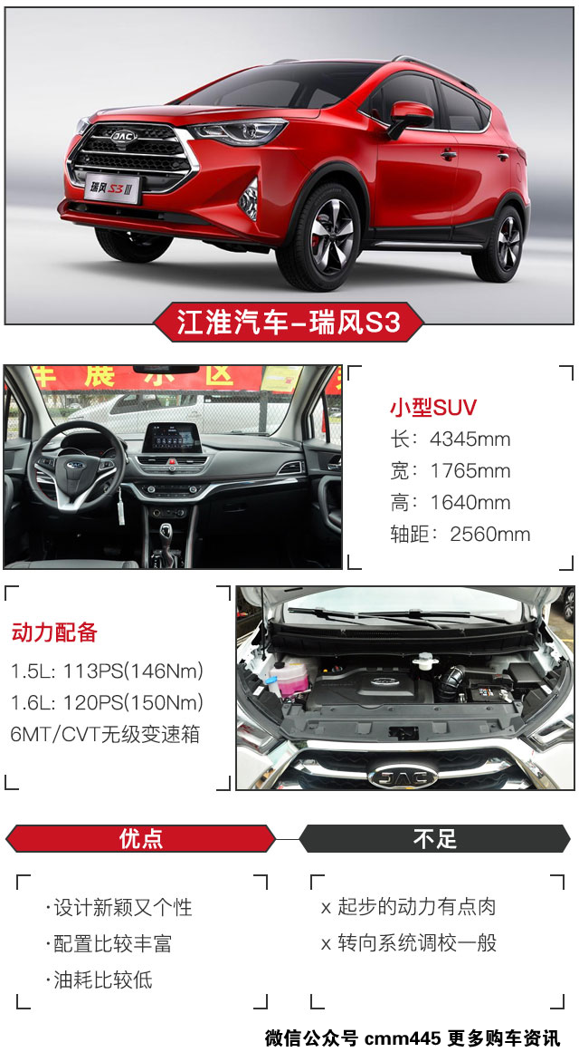 今天介绍的3款车型中,长安CS35的表现均衡而且行驶舒适性比较出色,适合追求舒适性与口碑的买家。瑞风S3的性价比不错,空间也挺给力的,在选购6-8万的SUV时,它也值得考虑。而凯翼X3作为最近上市的新车型它提供了比较丰富的设计、内外设计的时尚度不错,拥有较高性价比的它也值得大家考虑。