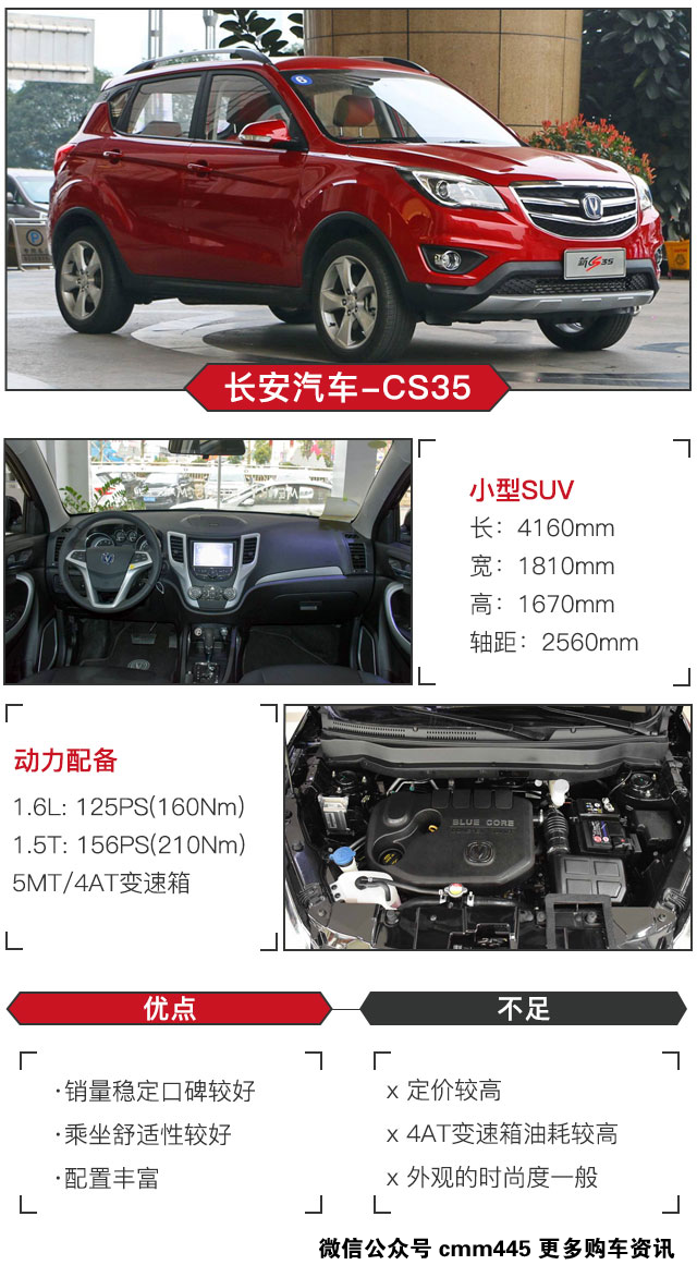 虽然长安CS35的定价较高,但是多年积累下来的不错口碑、新换上的新颖内饰让它在竞争激烈的现在还能焕发活力。稍有不足的是4AT变速箱虽然平顺性值得称赞,但是较少的挡位还是不利于降低油耗油耗的,其车主口碑百公里油耗为:7.8L(1.6L手动)、9.2L(1.6L自动),如果您在意油耗成本的话,手动挡的CS35也是一个不错的选择!