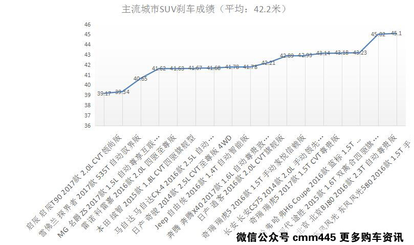 小虎我不管,你没有数据你说个P?好吧,看看这个主流的城市SUV与紧凑型轿车的刹车测试成绩对比,明显能够看出重量比较重的SUV车型在刹车成绩上劣势明显。