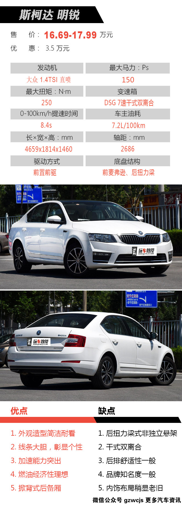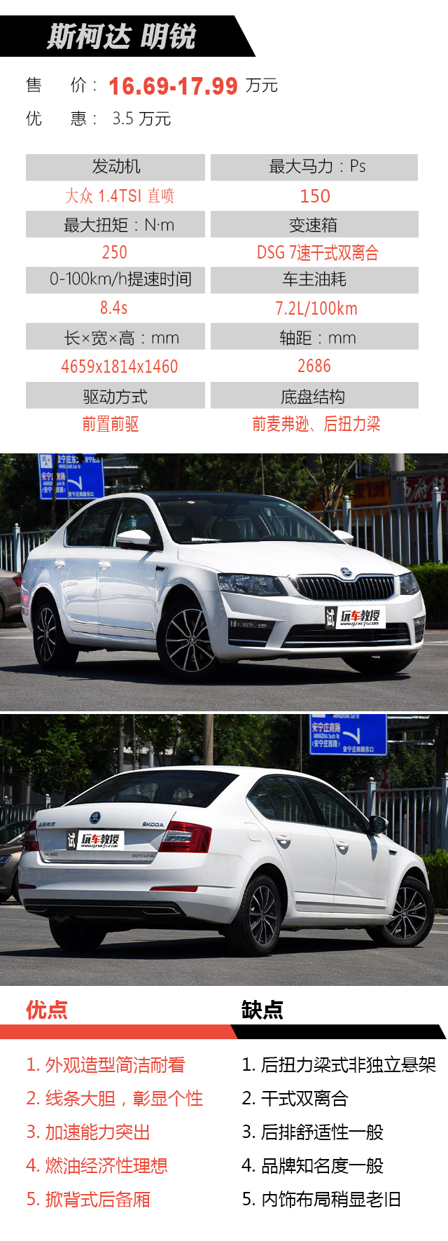 点评:新款车型对外观细节进行了优化的同时,拉风实用的掀背设计得以保留。1.4TSI+7速DSG的动力总成表现出喜人的加速能力,且兼具理想的燃油经济性,教授对明锐的动态表现给予足够的肯定。美中不足的是,后扭力梁悬挂牺牲部分乘坐舒适性,但动辄3万元的优惠会让你包容它一般的舒适性以及老气横秋的车尾设计。