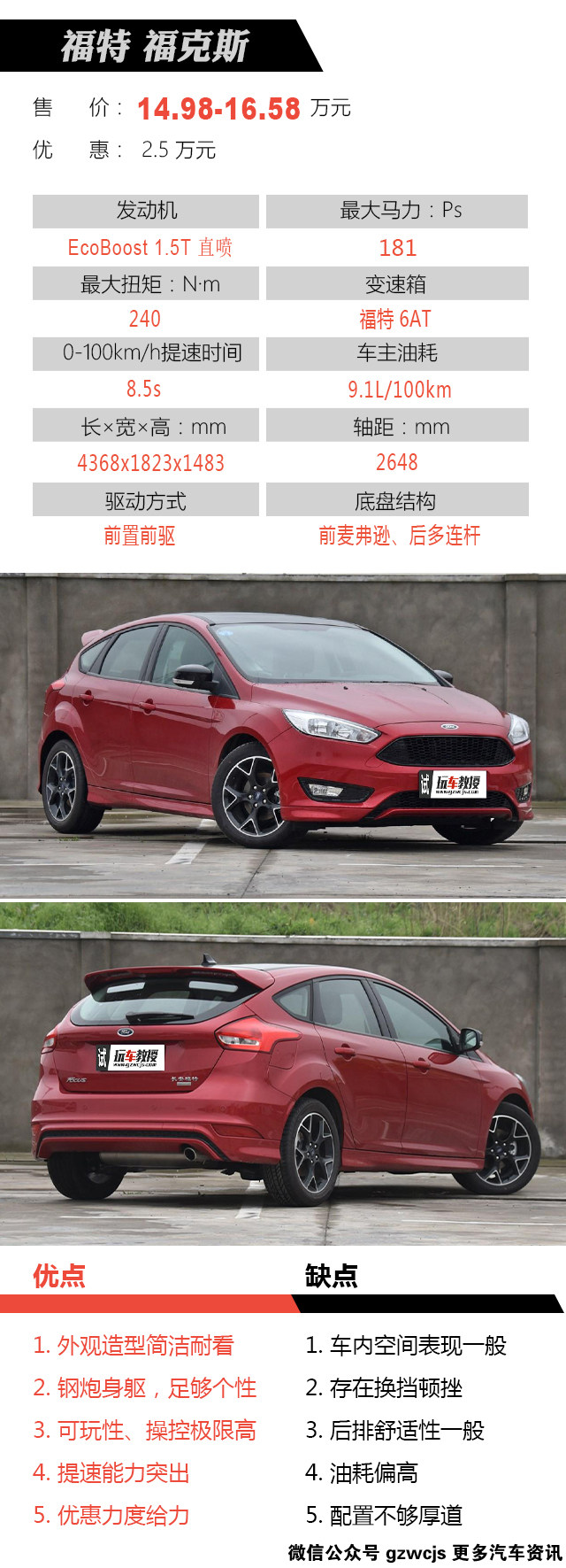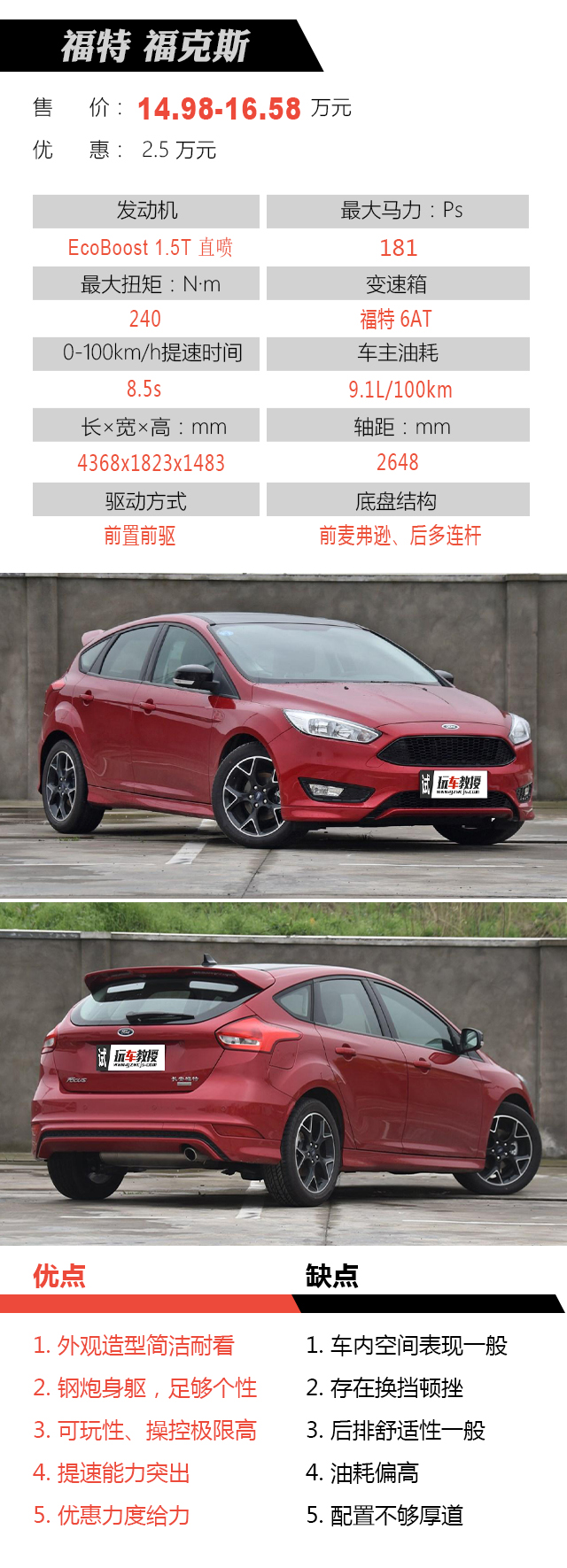点评:素有同级运动担当之称福克斯,不俗的提速势头、上乘的操控、扎实的底盘赋予其拔群的运动属性。CTCC限量版更是对外观专项优化,直击年轻群体张扬爱美的消费命门,辅以给力的优惠力度,让Focus成为玩车一族购车名单的常客。前提你得接受它不高的配置水平以及不够友好的车内空间。
