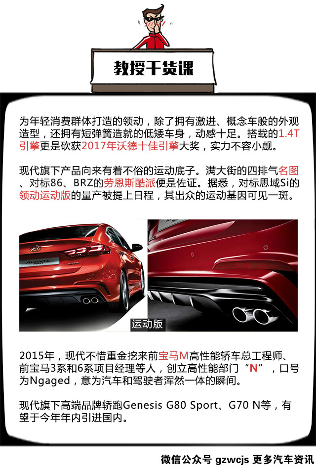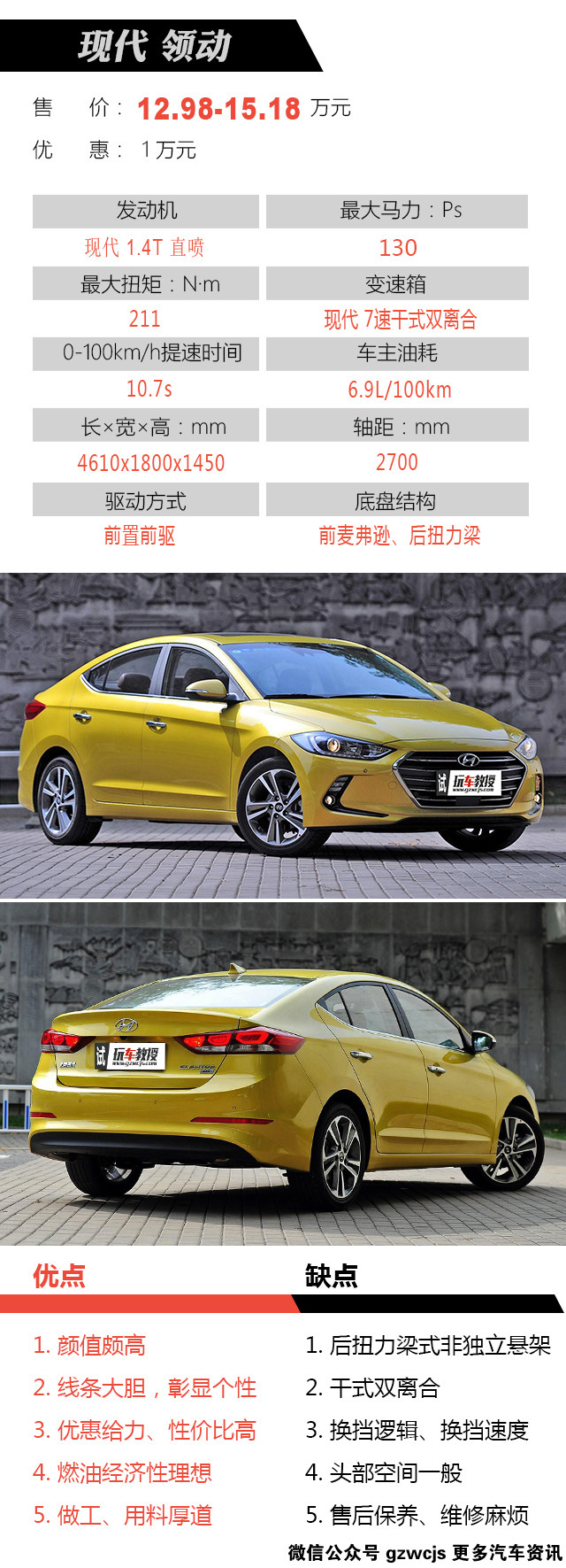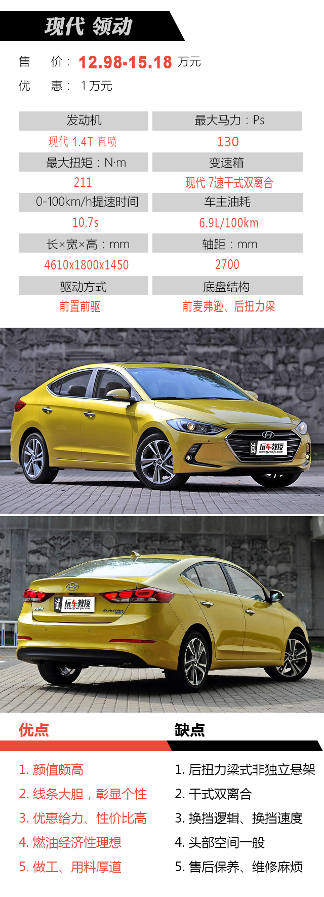 点评:韩系车向来是性价比的代名词,售价不高、丰富配置总能俘获大批预算紧张的消费者,领动同样如此。前卫大胆的外观、流线车身线条以及低矮离地间隙向路人诉说着自身不俗的运动底子。采用同级常见的前麦弗逊、后扭力梁式悬架,扭力梁、短弹簧与避振器的分离式布局设计最大程度优化后排空间,但面对较大坑洼时,行程不够长的弹簧稍显狼狈。