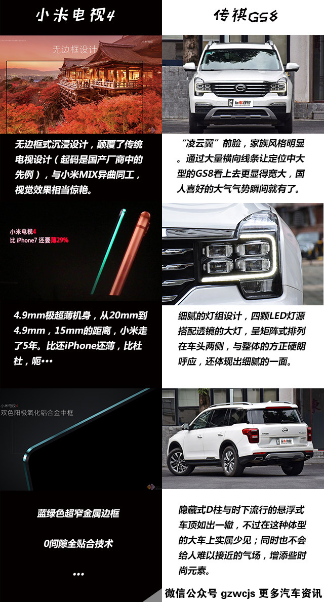 恕叫兽孤陋寡闻,小米电视4绝对是我见过最漂亮的一款电视,对比夏普、索尼亦如此。而传祺GS8的造型总结起来就是几个词:大气、威武、独特,符合大部分国人对SUV的审美,当然,GS8也用销量证明了张帆设计的成功。