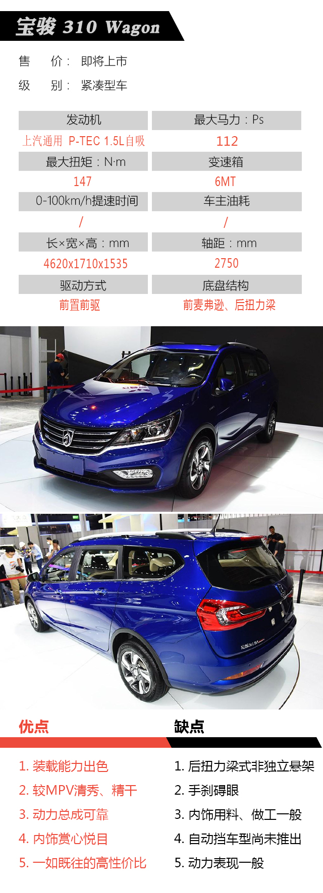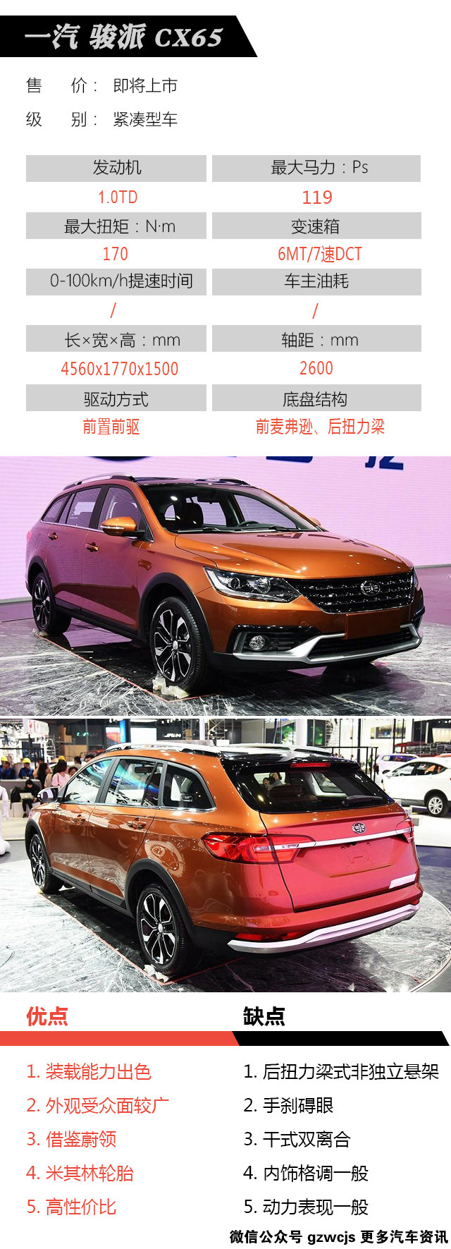 点评:在目前旅行车叫好不叫座的大环境下,首吃螃蟹的宝骏310 Wagon、骏派CX65率先抢驻该相对空缺的市场,最终能否如愿定价和推广营销至关重要。相比310 Wagon,CX65有着更多跨界车元素,平稳保守的外观受众面较广,期待二者定价谁更厚道。