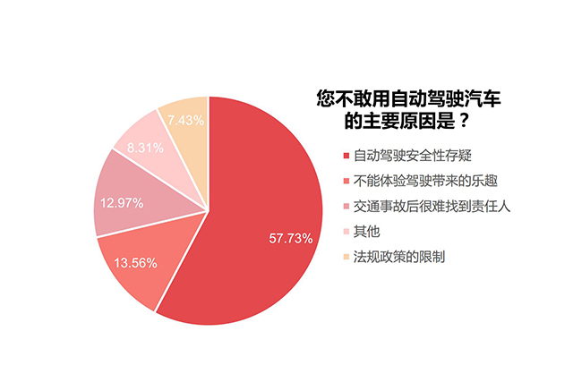 出于“好事不出门,坏事传千里”的传播效应,在拒绝使用自动驾驶的人中,有57.73%的人是出于对自动驾驶安全性的担忧。有13.56%的人认为自动驾驶磨灭了他们的驾驶激情(估计现在在马路上飙车的,就是这帮人吧)。但无论如何,装逼的力量还是吸引了8成的吃瓜群众投奔自动驾驶。