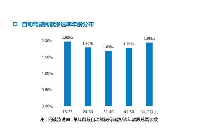 对于自动驾驶相关资讯的关注率,50岁以上人群的阅读渗透率为1.95‰,也就是说每1000人中就有2个人关注自动驾驶的资讯。对自动驾驶事业的关心,大叔们可是跟18-23岁(阅读渗透率1.98‰)的年轻人旗鼓相当。这也是今日头条深得大叔们喜爱的原因---各种紧跟潮流的新闻,比人民日报好看多了。