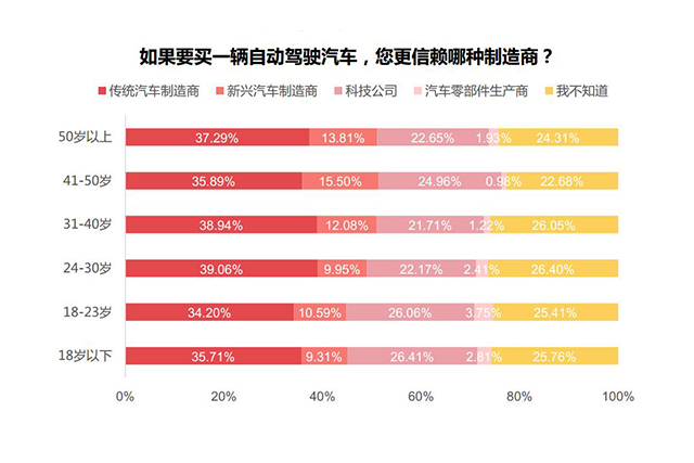 最乐于接受自动驾驶的是18-23岁的人群,接受的比例为84.04%。而且他们更青睐科技公司的自动驾驶技术(认可比例26.06%),仅比传统汽车制造商低8.14%。作为时代的急先锋,他们手持Iphone7,脚踩小米独轮车,走在街上都能自带朋克BGM。对于自动驾驶这样酷炫的玩意,他们理应比其他人都为接纳。其实我想说的是,自动驾驶接受程度这事,跟装逼指数是成正比的。