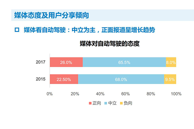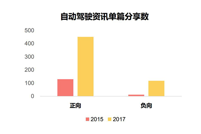 对于自动驾驶这事,绝大多数的吃瓜群众表示无任欢迎。有80.12%的人表示敢于使用自动驾驶汽车。同时,大家也更愿意身体力行地传播自动驾驶的美好。在2017年媒体关于自动驾驶的报道中,态度正向的报道占26%,态度中立的报道占65.5%,正向报道较2015年大幅增多。在媒体的引导下,吃瓜群众开始在社交媒体上分享关于自动驾驶的正向报道:2017年,单篇报道的分享数为400-500次之间,较2015年增加3倍。总之,大家都开始喜欢上自动驾驶,并且愿意为其站台