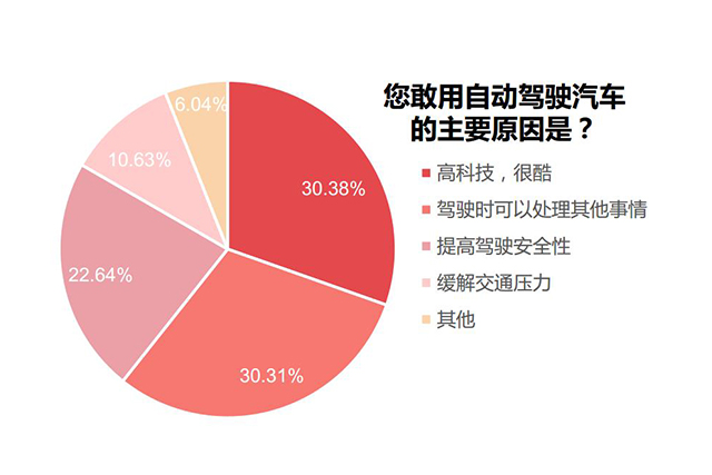 除了装逼以外,还有30.38%的人是出于“驾驶时可以干点别的”这个动机。在可期的将来,汽车很有希望将会取代马桶,成为最合适的晨读地点。当然,我相信更多的人会在车上聚精会神看小黄片。关于缓解交通压力这回事,只有10.63%的人真正在意。