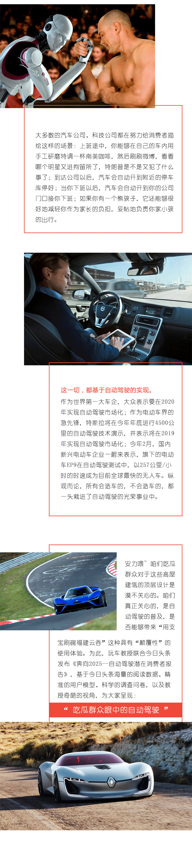 放眼到国内,今年4月,由工信部联合国家发改委、科技部印发的《《汽车产业中长期发展规划》当中,明确指出要以“到2020年,培育形成若干家进入世界前十的新能源汽车企业,智能网联汽车与国际同步发展;到2025年,新能源汽车骨干企业在全球的影响力和市场份额进一步提升,智能网联汽车进入世界先进行列。”为中国汽车产业发展目标。而百度亦在上海车展上宣布旗下自动驾驶项目--“阿波罗计划”,将开放、共享自动驾驶软件相关数据,向汽车行业及自动驾驶领域的合作伙伴提供一个“开放、完整、安全”的软件平台。只能说,这波席卷全球的科技浪潮真的是躲也躲不过。不过从这份调查来看,大伙似乎是一片乐呵呵地喜迎自动驾驶呀~