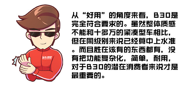 半天开下来,教授认为B30绝对是一台好开,好用的车。自然吸气发动机和爱信6AT变速箱的组合成熟稳定,保养压力小。它虽然没有一些特别突出的地方,但每一点都能做到刚刚好,不偏科,符合这个价位消费者的需求,是一台值得购买的车。