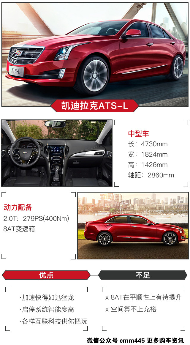 凯迪拉克ATS-L相比奔驰宝马的品牌知名度要低一点,且在销量上也差强人意。ATS-L是凯迪拉克专为中国打造的长轴运动型车。动力和操控性表现并不比宝马3系逊色。其在配置表现上有着美系车该有的水准,安全性高,全系配备了胎压监测、发动机启停技术、无钥匙进入/启动系统、6个安全气囊、主/副电动座椅、BOSE音响等配置,相比宝马要厚道很多,能看出凯迪拉克对于国内消费者的重视程度。