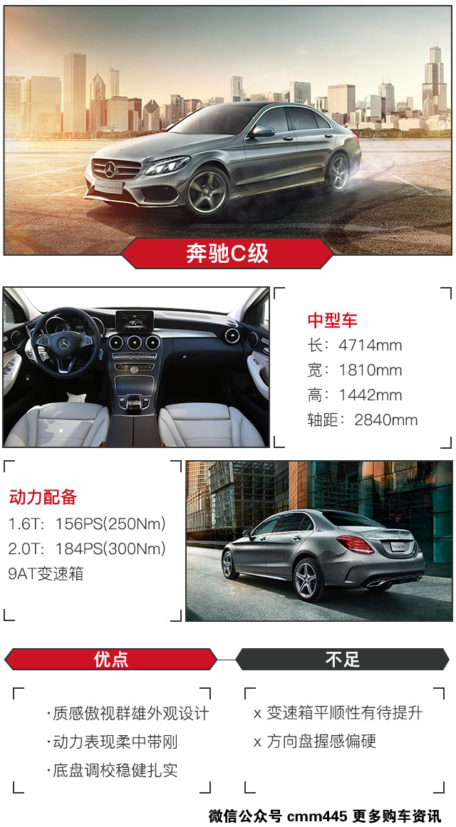 奔驰品牌在长辈印象中就是高大上的,是一种遥远的梦想。而现在奔驰品牌售价变得更亲民,能让大部分消费者能拥有。奔驰C级对于公司白领和事业刚起步的年轻人来说,就非常适合他们。百年工艺下的产品,有着扎实的整车基础,无论是在档次感和豪华感都不输同级别的宝马及奥迪。配置表现也很丰富,即使是低配车型都配备了主动安全系统、胎压监测、防爆胎、8安全气囊、发动机启停技术、无钥匙启动系统、主/副电动调节座椅等等,值了。