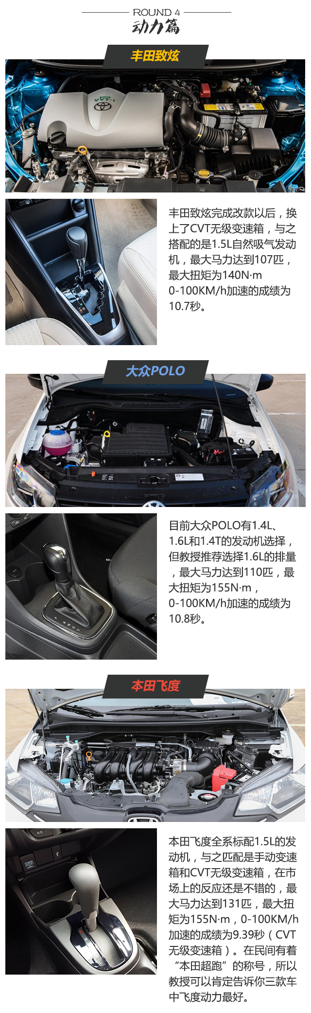 本田飞度和丰田致炫搭载的都是1.5L的发动机,但是本田搭载的是地球梦科技的引擎,所以这一台1.5L的发动机在飞度上最大马力比丰田致炫多出28匹马力;至于大众Polo,教授更推荐1.6L的排量,虽然表现一般,但是在大众成熟的造车工艺下,在质量方面还是表现的相当不错。