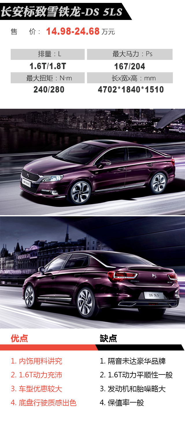 推荐理由:DS 5LS几乎是目前能买到最便宜的豪华品牌车型了,自上市之初它便把竞争车锁定为奥迪A3。而它的实际表现也确实达到了如今A级车的顶级水平,内饰的用料以及氛围的营造相比起A3、宝马1系等主流车型更对得起“豪华品牌”这个称号。并且在它身上我们也能看到法国人对于中国市场放下的执着,2715mm的轴距也是我们目前能买到最长轴距的紧凑型车了。