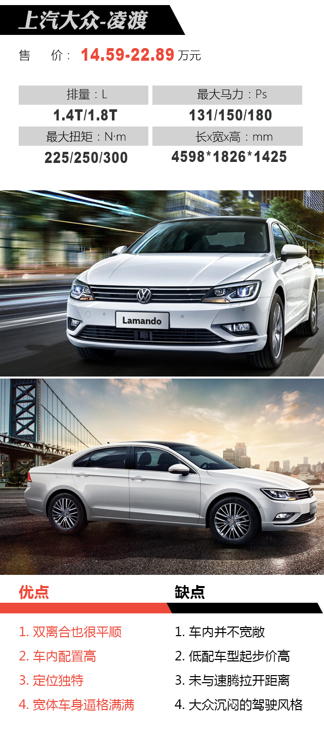 推荐理由:常年在车圈混迹的网友都听过这样一句话“一低遮百丑”。而大众则非常聪明的通过更为扁平的车身造型让凌渡有着看起来非常低趴的车身,能让你在车流中一眼就认出它来。除此之外凌渡还有着大众最新开发的平台、新的1.4T系统、全新的MQB平台、诸多的车内新装备。如果你希望购买一款德系品牌车型,又觉得朗逸、速腾已经烂大街了,不妨看看这款颜值更高的轿跑车型。