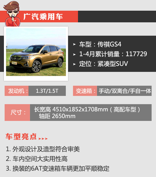 每个品牌都有自家的明星车型,又或许是黑马车型。就拿广汽传祺作为例子,在2015年初传祺GS4在北美车展上亮相,厂家慢慢将精力从传祺GS5转移到了传祺GS4车型上,事实证明这个战略是成功的。从1.3T到1.5T再到6AT车型,传祺GS4的销量可谓是一路高歌,成为国内SUV市场中最大的黑马,虽没能超越“神车”哈弗H6,但销量还是能处于二三的位置。