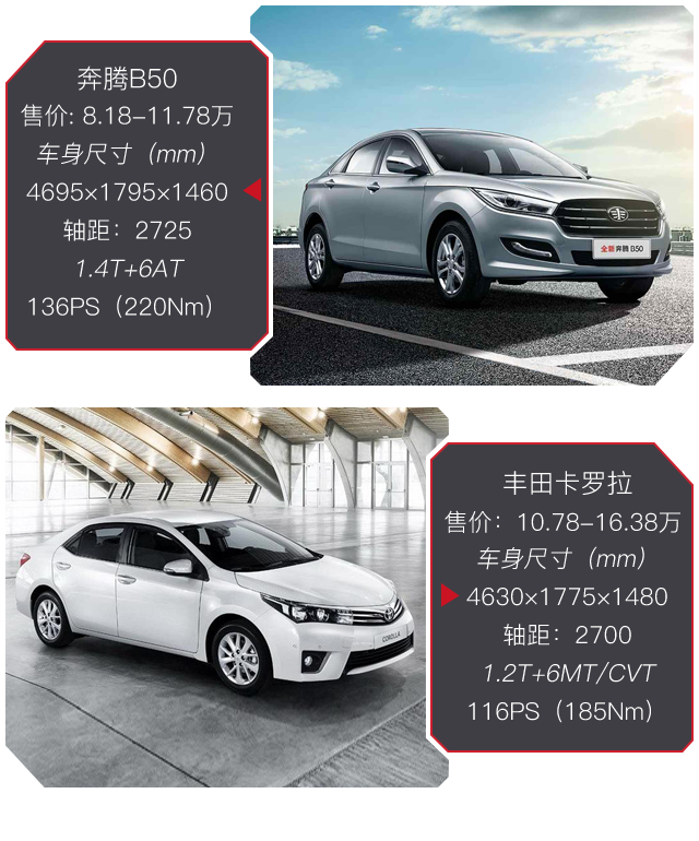 卡罗拉是世界级神车,开着没毛病但显得太中庸。拿奔腾B50来对比是一个很有趣的选择,因为它的底盘参照的是马自达6睿翼的设定,所以这两车有些殊途同归较量的意味。