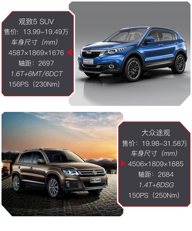 途观是德系SUV的代表作,而观致5 SUV其实也是一款很具欧洲车风格的车型,底盘厚实感完全不亚于途观。而且动力采用的1.6T+6DCT的组合在日常输出环境都很够用,同样的价格你却只能选择到1.4T版本的途观!同时,观致5 SUV在内饰工艺上下足了劲,再加上更加厚道的配置水平,性价比确实要比途观高得多。