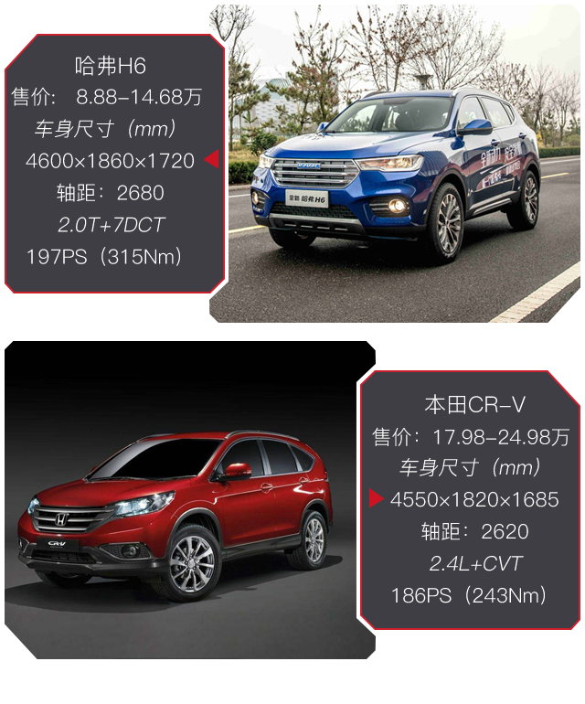 这个组合就有点意思了吧,本田CR-V可以说是将国内SUV风潮带起来的先行者,想当年加价加到你怀疑人生。而哈弗H6则是将SUV这个辉煌发扬光大者,如今SUV榜首冠军位置无人可敌。要说它们的关联,你可知道哈弗H6的底盘正式逆向研发CR-V而来?