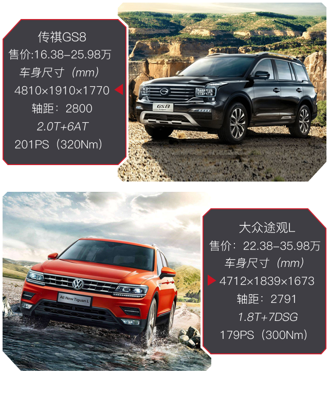 中型SUV选取的这两款都是目前的当红炸子鸡啊!途观L刚上市时还要加价,而传祺GS8也是一车难求。出自MQB平台的途观L确实具备很出色的实力,空间阔绰动力匹配佳;但传祺GS8真不是省油的灯,首先7座布局就让途观L吃了一壶,而且更大的车身尺寸以及方正的设计在气场上也有着不小的加成。