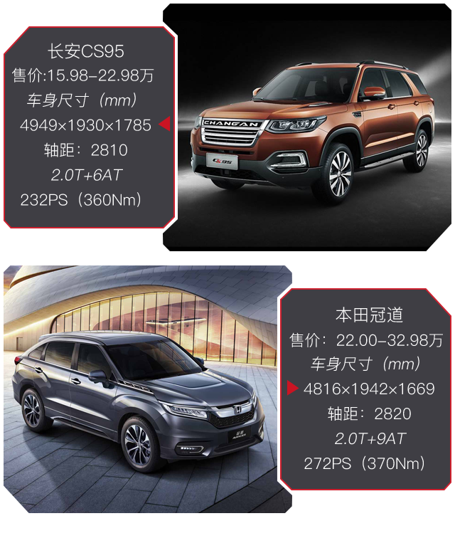 这两个家伙的组合也非常有意思,有着“买发动机送车”称号的本田可真不是盖的,除了1.5T发动机玩的溜外,2.0T也是秒杀大部分同级别车型。而长安CS95这次打出的招牌是国内最强蓝鲸2.0T发动机,使用的技术也确实牛逼。虽然动力数值上不如冠道,但不能忽视的是CS95的最大扭矩输出点在1750转,比冠道的2250转要早不少。而且CS95还有超增压模式,最大扭矩能增强到380牛米,也是一个不可多得的技术。