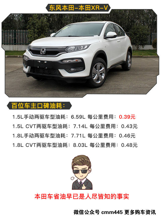 XR-V省油可以说是意料中事,本田车变油老虎恐怕才是大新闻。能这么省油,首先1.5L发动机用的是直喷技术,且缸体和缸盖都是铝制材料,重量更轻。至于1.8L车型的缸体和缸盖材料与1.5L车型一样,但采用的是多点电喷技术,避免了积碳问题,因此油耗会高一点点。