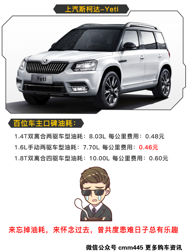 撇开顶配车型,Yeti的油耗表现还好,双离合变速箱的高传动效率在一定程度上保证了燃油经济性。但是有一点值得注意,1.4T和1.8T的Yeti都是加95号汽油,这明显增加了燃油费用。