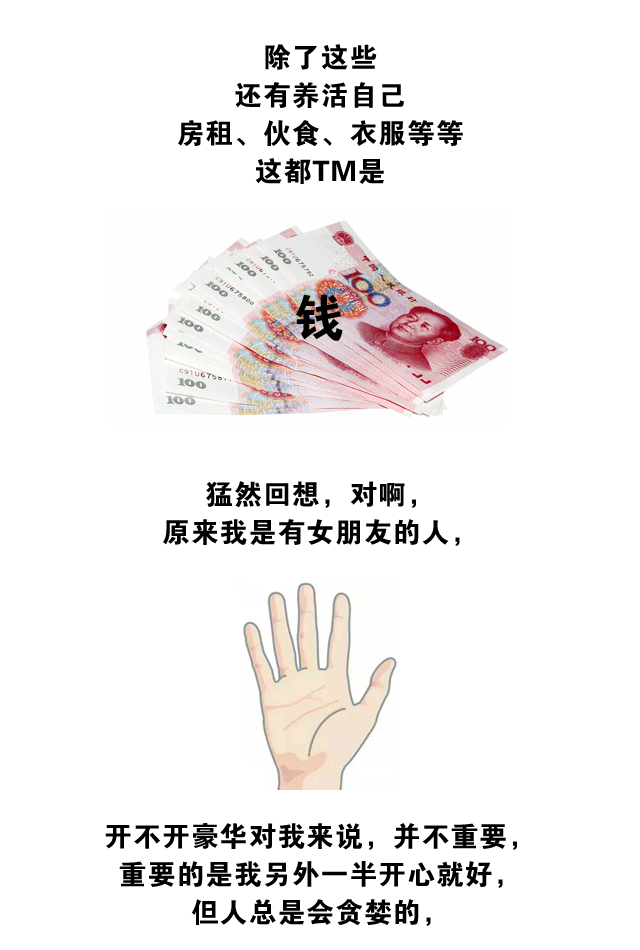 月入过万,过着好车生活,表面是风光的,但暗地里我是悲伤的。除了每个月要还几千大块的车款之外,车子油耗不低还要加95#汽油,单次小保养就要将近1000元,另外每年还要交数额不少的保险费用,停车费用,养一台豪车就如养一个老婆一样,怪不得别人都说车是第二个老婆,然而作为单身狗的话,就只能跟车双宿双飞了,哪有闲钱去泡女神呢?