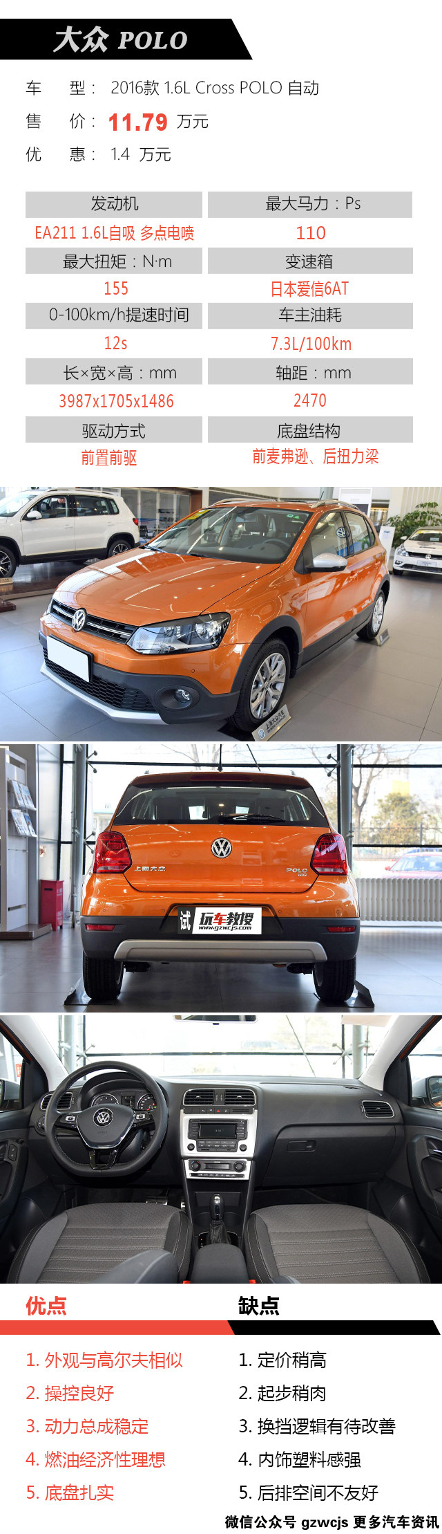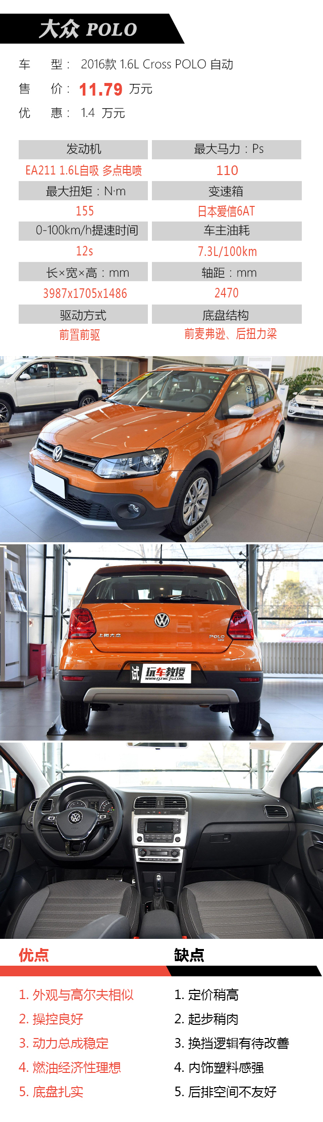 点评:外观造型与高尔夫颇为相像的POLO,知名度远没有老大哥来得高。这除了与厂家产品定位策略有关外,还与国人偏爱大尺寸的审美不无关系。想当初,这套EA211 1.6L自吸+爱信6AT的动力组合为大众喜人的销量撑起半边天,技术老旧但胜在成熟可靠,辅以扎实的底盘表现,赋予POLO一定的可玩性。