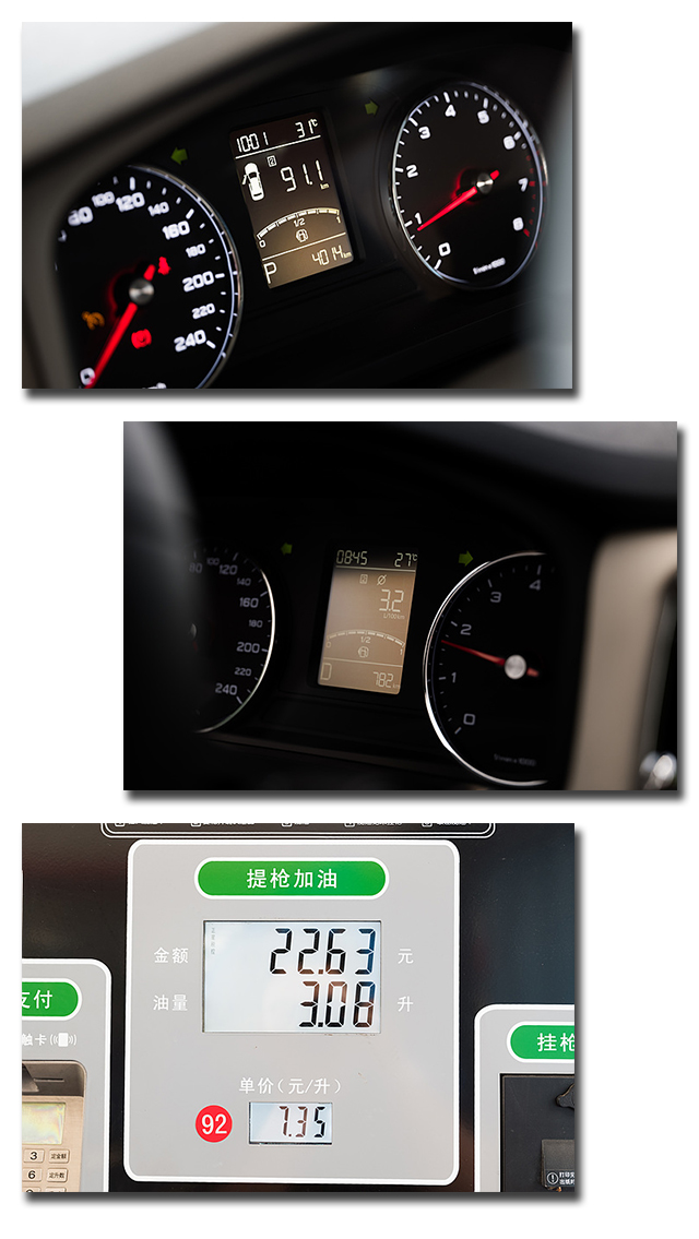 节油比赛路段的路况不错,很快我们就再次进入服务区加油站,通过跳抢加油的方式来计算燃油的消耗,教授驾驶的车辆一共行驶了 91.1km,加了3.08L油,表显油耗为3.2L/100km,实际计算油耗为3.38 L/100km,我们的车辆可是满载加上开空调的哟,非常贴近现实用车状态,这样的表现,教授已经没什么话想说的了。