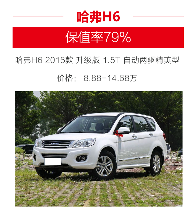 和“规模经济”不同的是,二手车市场保值率往往是“汽车保有量越大保值率就越高”。其根本的原因是:这车保有量越大,维修保养就越方便,日后使用起来的成本也就更低。哈弗H6去年一年卖出了58.1万,第4年坐实SUV销量冠军,如此大的保有量,你说保值率能不高吗?今年上海车展,全新哈弗H6正式上市,除了一贯的群众基础、精细的做工、丰富的配置以外,新款车型还增加了全新的动力总成、一套丰富的主被动安全配置以及年轻了20岁的动感设计。如果长城不出什么幺蛾子的话,哈弗H6这保值率估计会一直这么高下去。