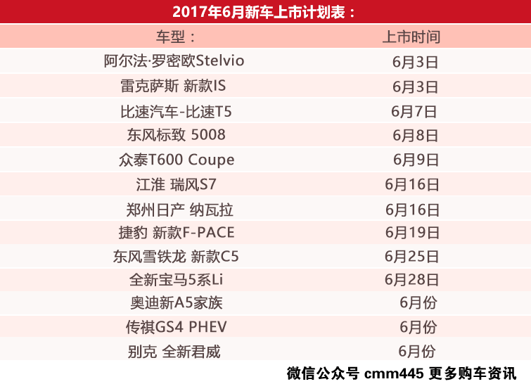 6月要上市的新车真不少,阿尔法·罗密欧Stelvio、全新宝马5系Li、别克全新君威等等车型 都即将和大家见面,下面咱们就通过一个表格总览一下这些新车的上市时间。