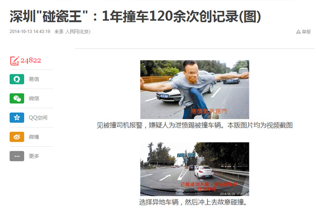 在人民网的一篇报道里,深圳某位碰瓷界的泰斗,一年就能创下120次的碰瓷。当然,这是经交警核实的接警记录。选择私了的碰瓷,那真是海了去了。