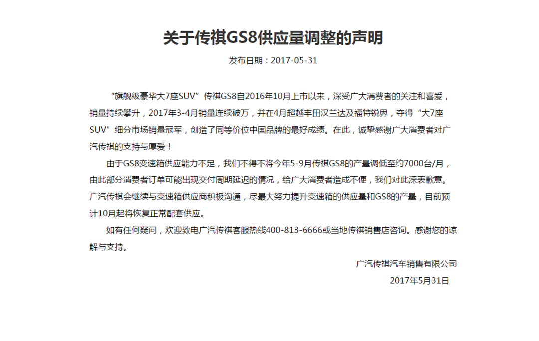 算一算价格:18.28万的车价,购置税就得15624元,再加上一笔不菲的保险费用,所以买一台GS8怎么也会超过20万大关,但是目前它依旧处于一个供不应求的状况,而在4月的销量方面也卖出了10024辆。选择GS8你的提车时间可能要等一段很长的时间,前天传祺官网也发布了一则关于广汽传祺GS8供应量调整的声明,由于所搭载的6AT变速箱供应能力不足,在5-9月分传祺GS8的产量调低至约7000台/月,所以已经等车的朋友也可能会遇到延期交车的情况。而准备入手的朋友们也得关注,因为有可能你的等车时间会较长。
