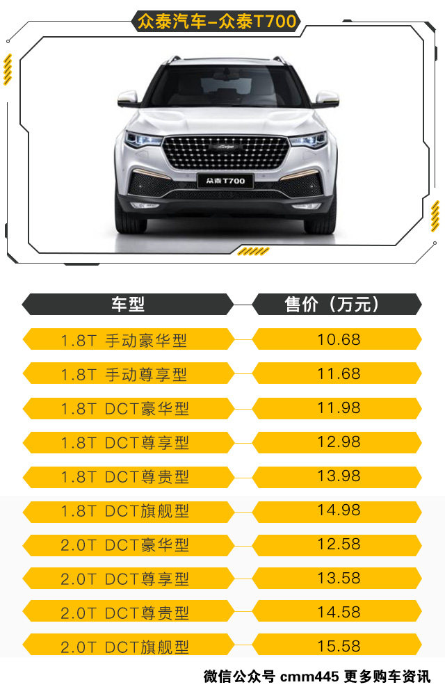 它搭载1.8T和2.0T两款涡轮增压发动机,最大功率为177马力和190马力。其中2.0T发动机为三菱的4G63S4T机型,可输出250牛米的最大扭矩,而传动方面众泰T700将采用5速手动或6速双离合变速箱。