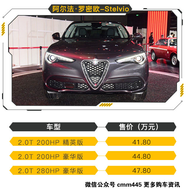 在深港澳车展上,阿尔法·罗密欧公布了旗下全新SUV车型Stelvio的正式售价,其售价区间为41.80-47.80万!并且有消息称,至2017年底阿尔法·罗密欧将在全国建成73家经销商,而Stelvio QV高性能版车型也会在后期引入。