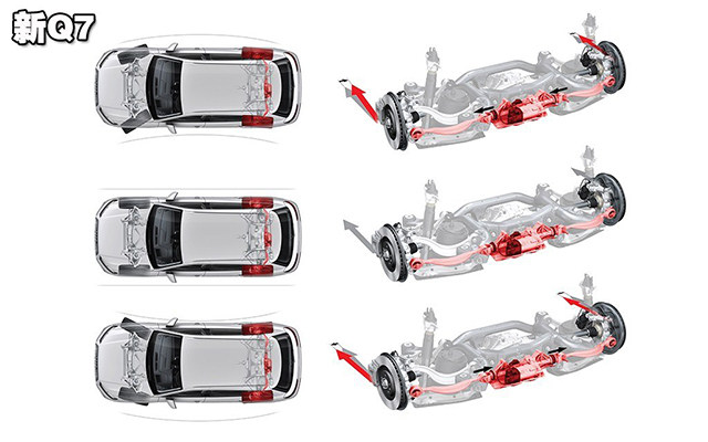 提到四驱系统,肯定得说说奥迪的quattro全时四驱技术。全新奥迪Q7与老款Q7不同,它采用了全系的MLB Evo平台(采用这个平台的还有全新奥迪A4和宾利添越),所以在底盘设计上,也会发生变化。全新奥迪Q7在底盘上运用了更多的轻量化材料,减少了整体的车身重量,从而降低油耗。部分配置的新奥迪Q7还匹配后轮主动转向系统,由电机控制实现最大5°的转向角度,能够在车辆过弯的时候,减少车辆的转弯半径,让车辆更加灵活,提高四驱系统在过弯时的稳定性。