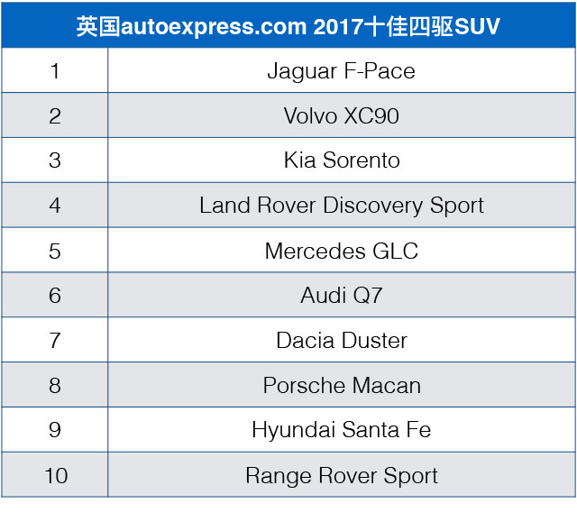 虽然说中国人买SUV都是贪图大空间高底盘,但其实,我们想买到的,还是一辆可以四驱的SUV,毕竟四驱在野外的脱困能力更强,对于各种复杂车型的征服能力更厉害。今日,由英国媒体autoexpress.com评出了2017年十佳四驱SUV,其中有部分车型在国内上市,我们一起来看看分别有哪些四驱SUV,受到了这么高的评价。
