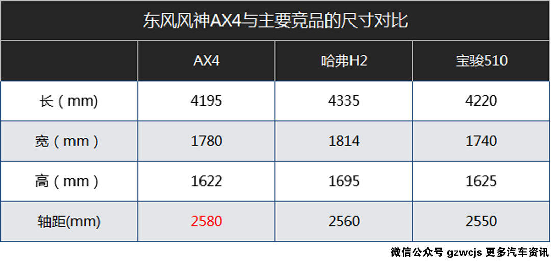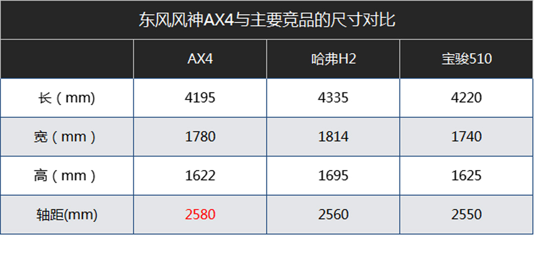 从厂家最新的披露的消息,AX4的三围尺寸为4195*1780*1622mm,其轴距为2580mm。相比于竞争对手而言,它的尺寸上是不占优势的;但轴距是这几款小型SUV当中最为出色的。不过在小型SUV当中,这多出的一点点轴距相信对其空间的帮助不会太大;实际的空间表现最后还得看实车。