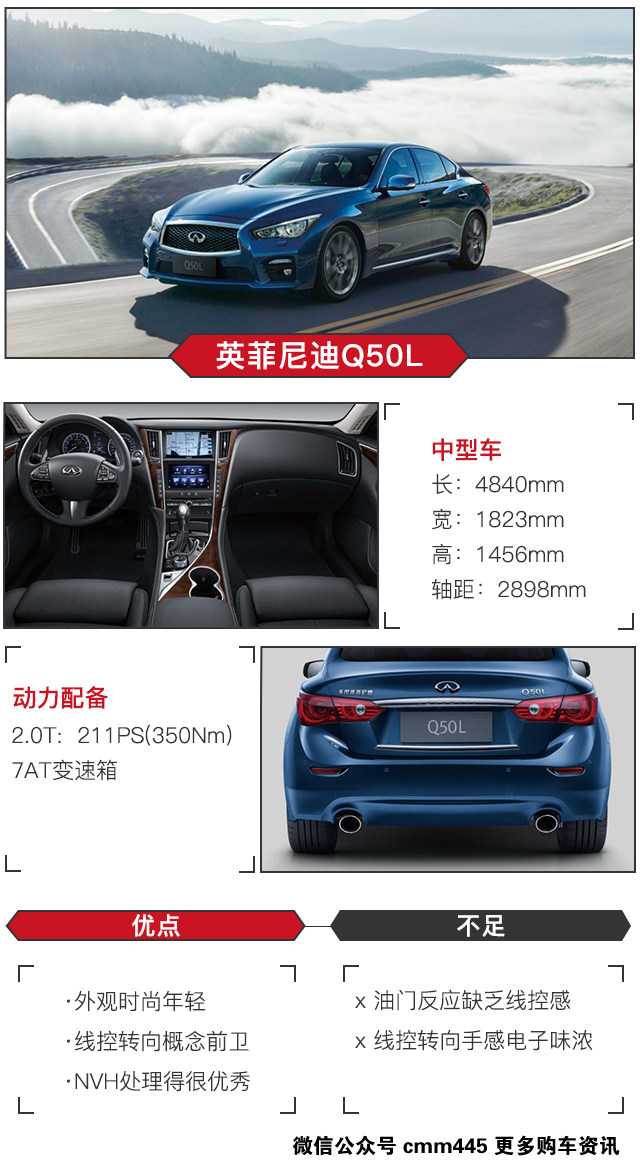 英菲尼迪Q50L外观设计上看起来很凶悍,炯炯有神的大灯可以迷倒众多外观控,整体设计营造出运动氛围,但内饰看起来怎么都衬托上运动外观,略显中庸。Q50L全系搭载2.0T发动机,最大马力为211Ps,匹配7AT变速箱,动力输出平顺上较为一般,让其加速表现不如人意,可喜的是,全系标配多连杆独立悬挂+横向稳定杆的组合,使车辆在弯道中表现出的支撑性和跟随性都非常高,拥有不错驾驶乐趣。
