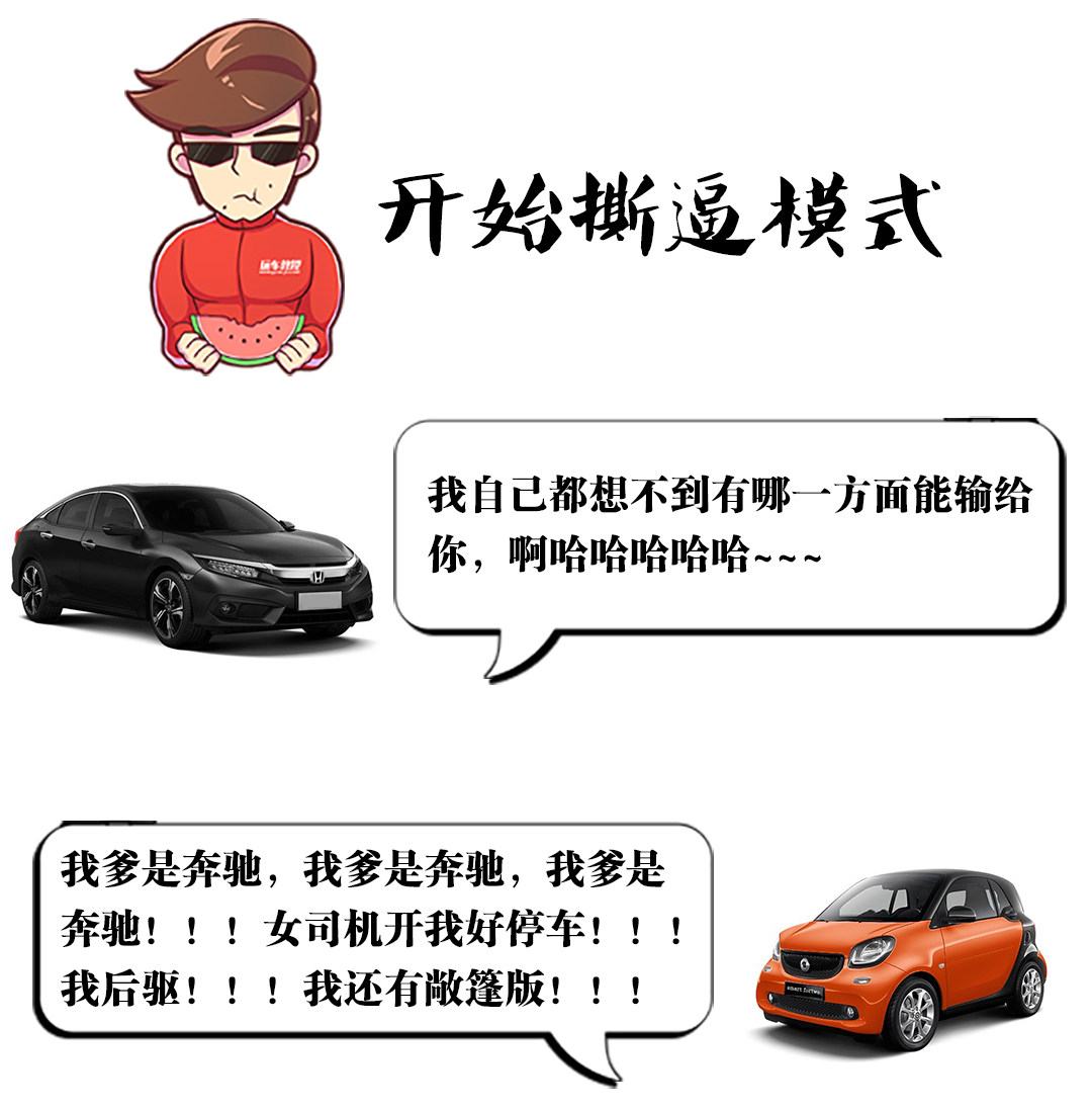 思域其实说得没错,就一台车本身的产品力来说,smart绝对是被思域吊打的。就算撇开思域不谈,smart的机械表现也确实不怎么样,动力跟北极雪橇犬差不多,变速箱顿挫,又轻又小的车身压根连高速都不敢上。