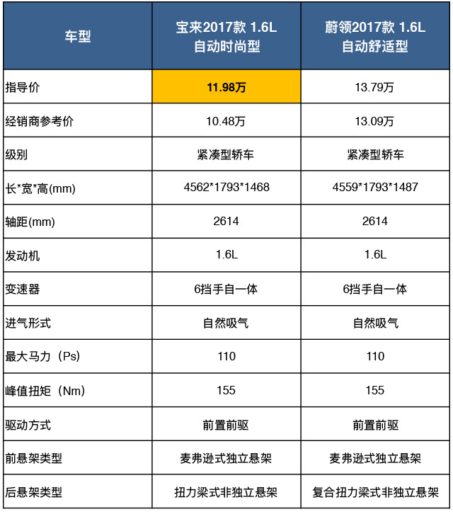 我们可以参考一下经销商的价格,宝来自动最低配为10.48万起,蔚领自动最低配为13.09万起,蔚领在价格上比宝来贵了大概2.6万元,但在配置上,多了一个胎压监测,定速巡航,全景电动天窗,前雾灯和后视镜加热等等,而且还能拥有更大的后备箱空间,这个价格差价教授认为非常值。