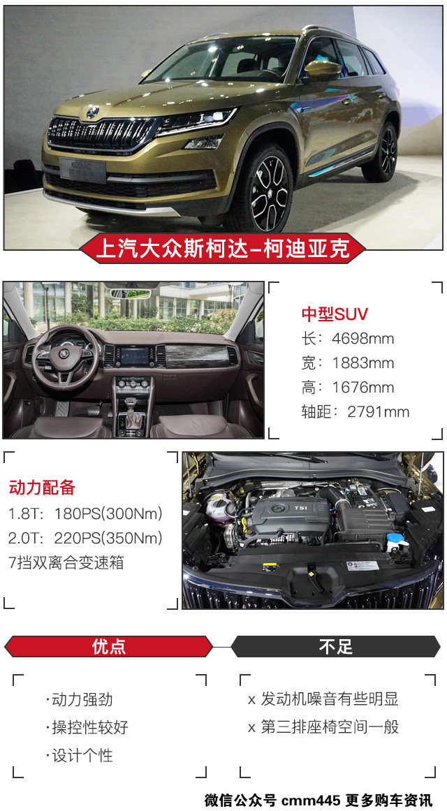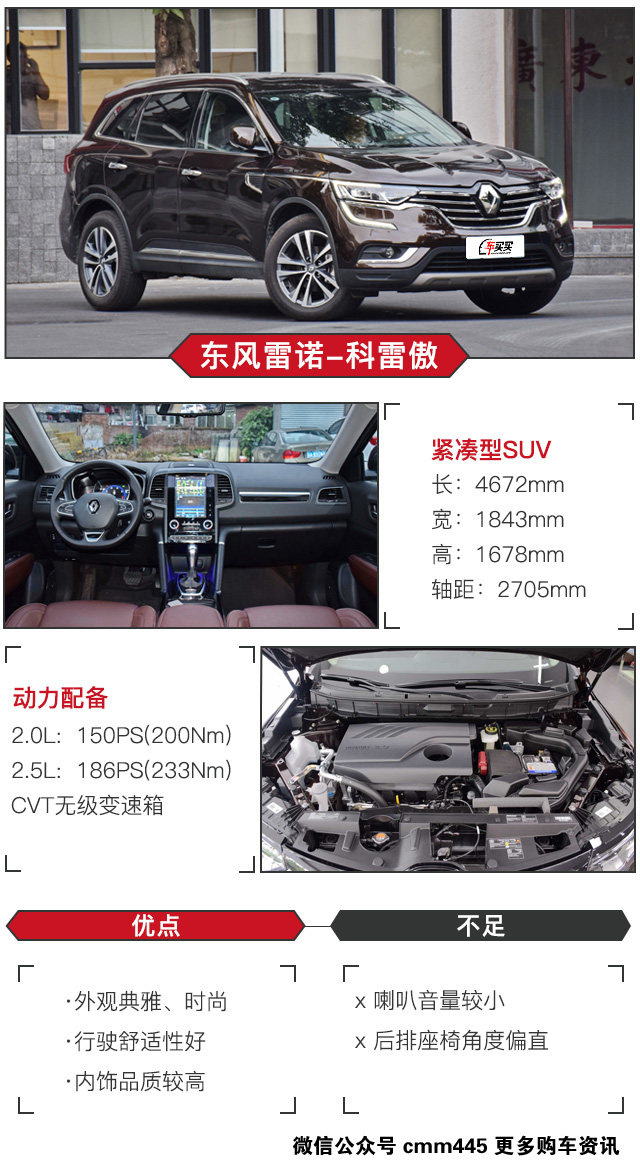 在入门中型SUV和紧凑型SUV概念日渐模糊化的今天,大家可以别太纠结于厂家给出级别定位,选择适合自己的就行。虎哥上面提到的科雷傲设计典雅而且舒适性好;探界者在舒适性与运动性方面比较均衡,同时它的售价是最接地气的!柯迪亚克的操控性和动力尤为突出。各位看官们都知道怎么选了吗?